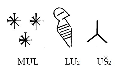| '루(Lu)' 표기는 사람의 머리 또는 흉상을 묘사한 것으로 단순하게 쓰일 경우 '사람'을 의미합니다. 이 표기는 대개 남자 이름 앞에 위치하여 그 사람이 노예나 농노가 아니라 전문직에 종사하는 사람임을 의미합니다. '우쉬(Uš)' 표기는 다양한 의미를 갖습니다. 예언문학에서는 '죽다'라는 동사로 쓰이기도 하고, '죽은 상태'를 의미하기도 합니다. 따라서 전체 의미는 '죽은 이', 또는 '시체'가 됩니다. |